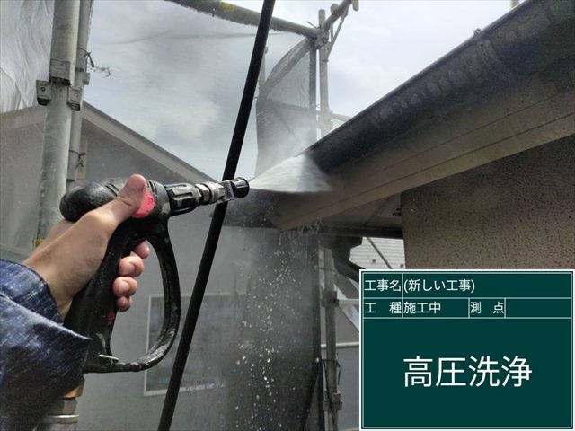 破風板は塗装の前に高圧洗浄で汚れを落としています。