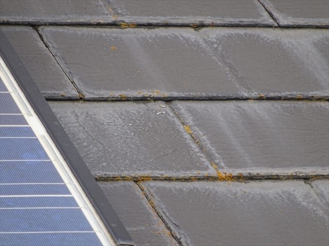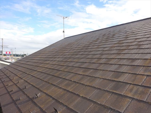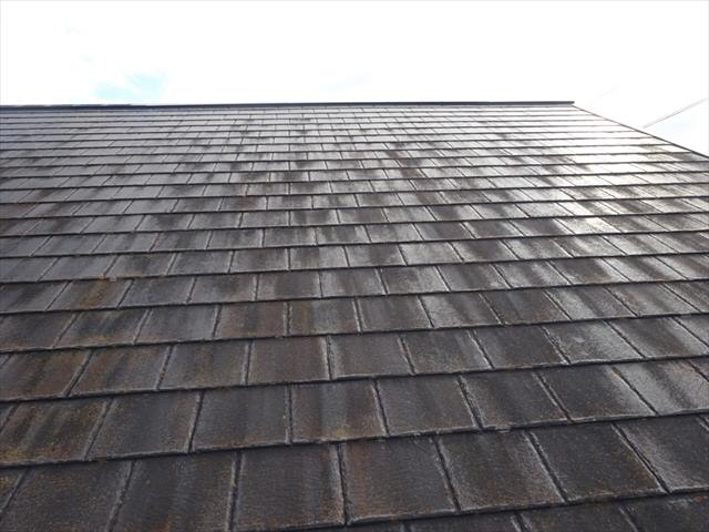 築22年のスレート屋根は、全体的に色褪せて苔が生えてまだら模様になっていました。