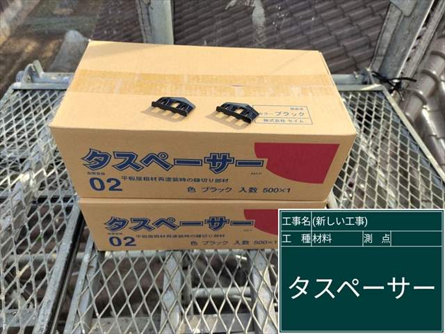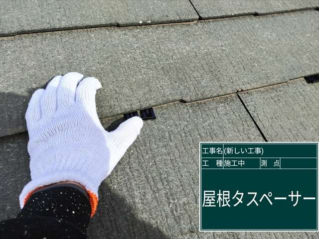 霞美装では、確実に隙間を確保するために、一枚のスレート屋根に2個のタスペーサーを使っています。