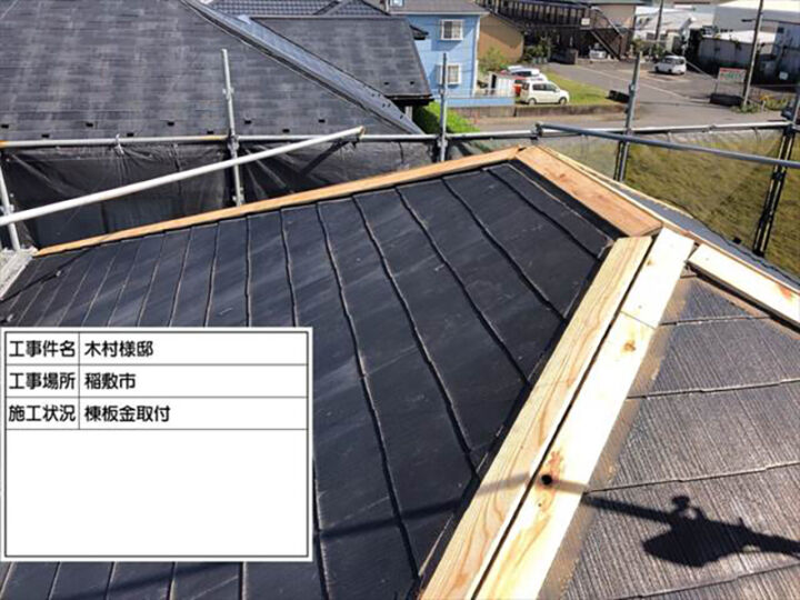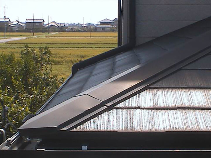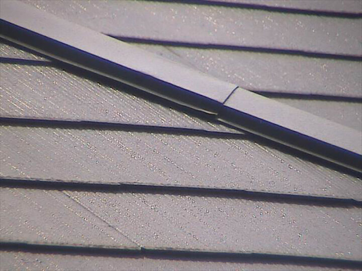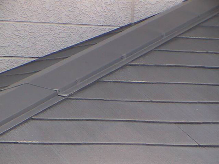 棟板金(むねばんきん)はスレート屋根の屋根材同士が重なった天辺にある金属の板のことです。瓦だと棟(むね)ですね。棟部分が板金で構成されるため棟板金と呼ばれます。