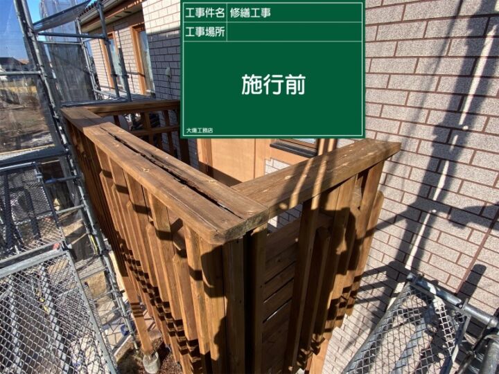 土浦市の外壁塗装現場でウッドバルコニーの補修をおこなっています。