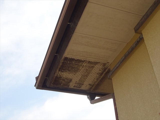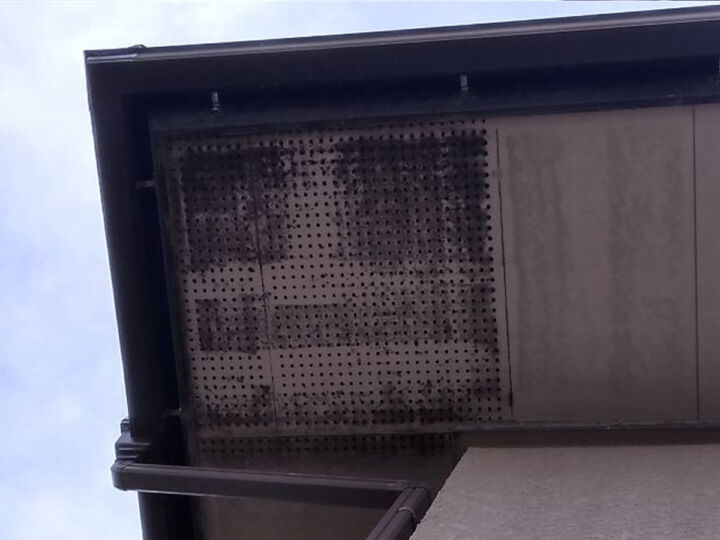 軒天の黒ずみといえば黒カビですが、こちらは軒天の換気口部分を埋めているようにみえます。
