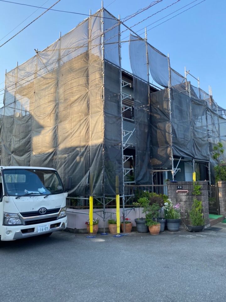 洗浄時の水や塗装時の塗料飛散を防ぐため、ネットを張りご近所への配慮をいたします。倒壊の恐れがありますので、風の強い日等にはたたんで括り付けます。