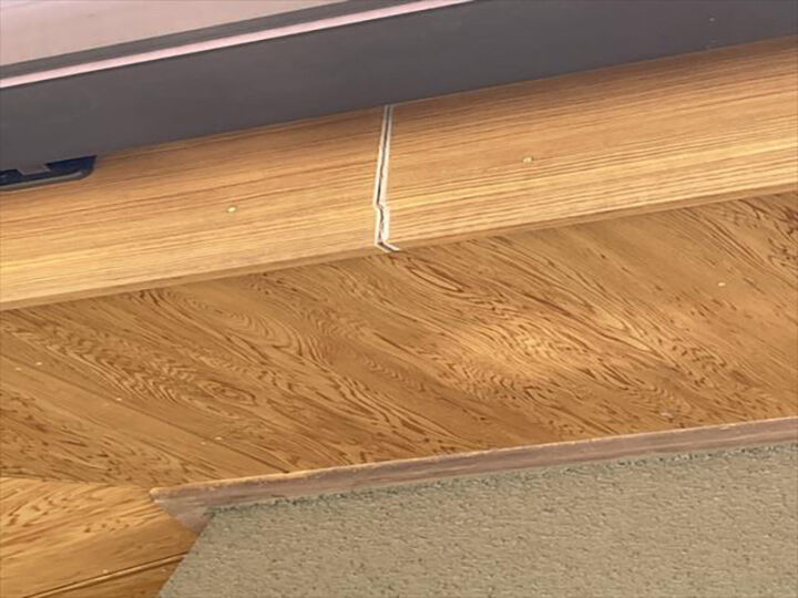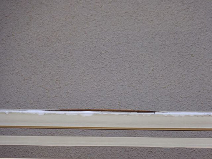 こちらは黒く見えている部分がサッシの下枠です。下枠から細いひび割れ(ヘアクラック)があります。