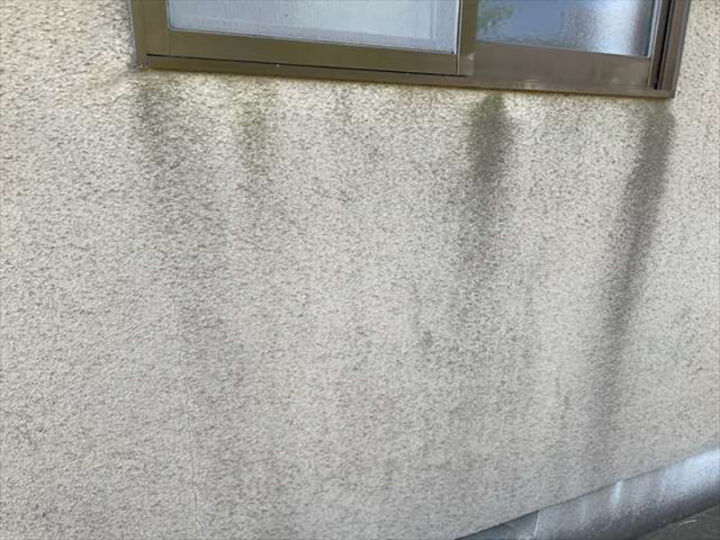 この汚れは、サッシに付着した埃や汚れが雨と一緒に伝い、外壁に付着してシミとなったものです。