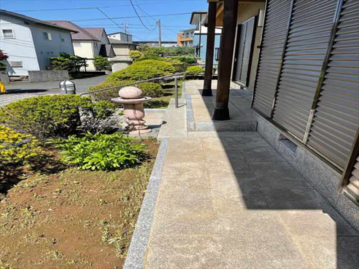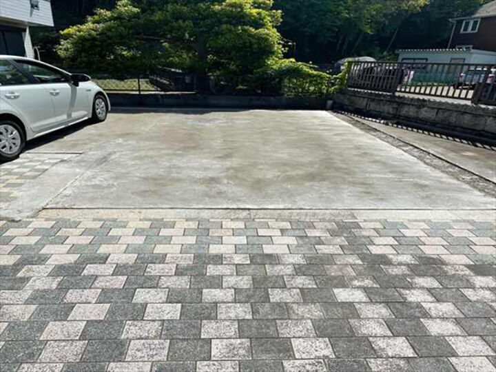 土浦市築24年の現地、犬走りと駐車スペースです。