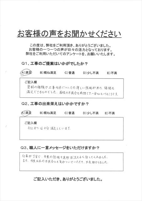 - 塗料の種類や工事内容についての詳しい説明があり、価格も満足できるものでした。屋根の不具合も修正でき、一安心というところです。