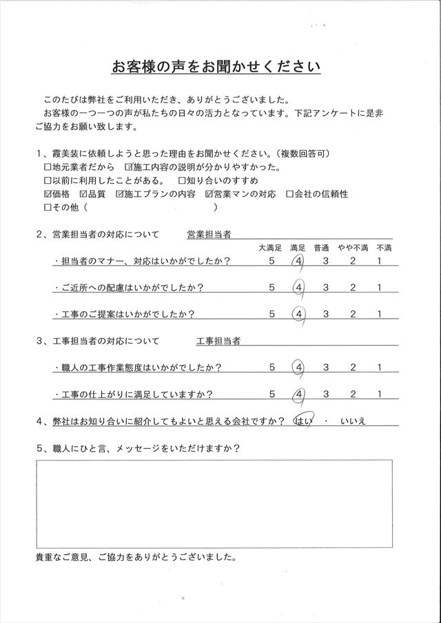 とにかく外壁裏の藻が気になっていました。洗浄してもらえた時にはほんとうにすっきりしました。