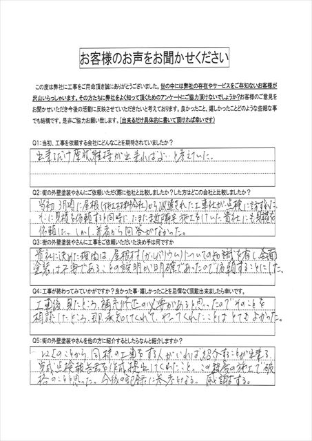 つくば市のお客様から施工後のアンケートを頂きました。近隣で施工をしていた弊社にお話をいただきご契約施工となりました。説明明確・破格の対応・修正依頼即対応!感激三拍子/つくば市