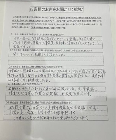 見積の内容も、建物の正確な塗布面積の積算、及び塗料メーカー・使用する塗料などが明確で有り、納得したことが決め手です。 - 工事が終わってみていかがですか?良かった事・嬉しかったことを忌憚なく頂戴出来ましたら幸いです