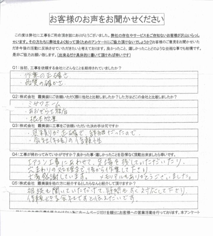 - 相談にも親身になって対応していただき、疑問にもすぐに答えてくださる、とても信頼できる会社だとお伝えしたいです。