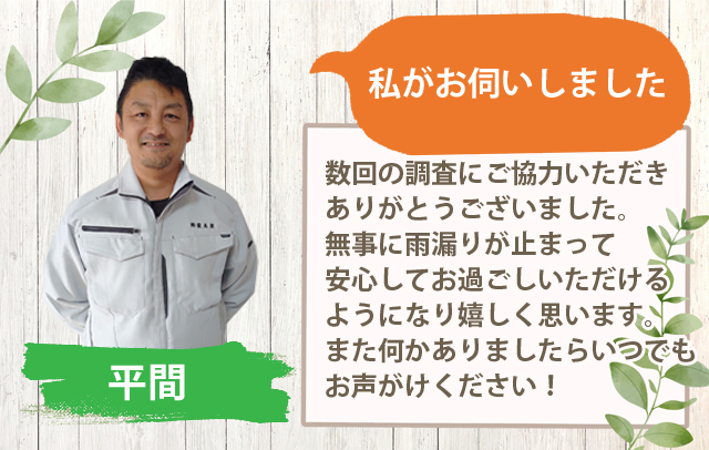 雨漏りを無事に修繕でき、お客様から嬉しい口コミをいただき、スタッフ一同感謝しております。