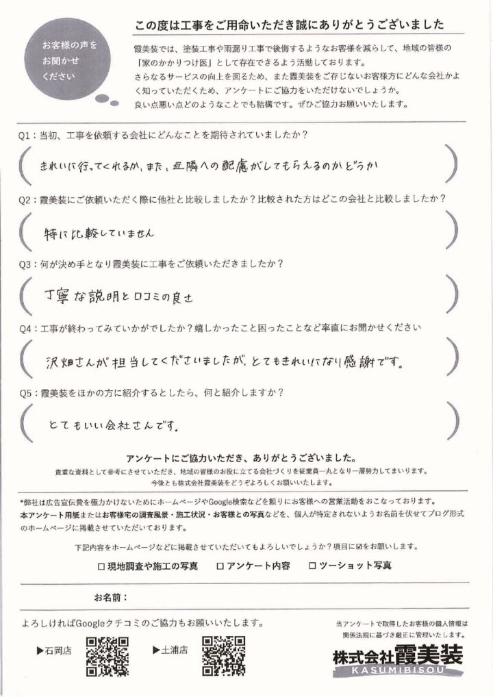 担当の沢畑さんが最後まで丁寧に対応してくださり、仕上がりもとてもきれいで感謝しています。