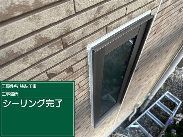 石岡市外壁塗装現場のサッシ周りのシーリング増し打ちが完了しました。