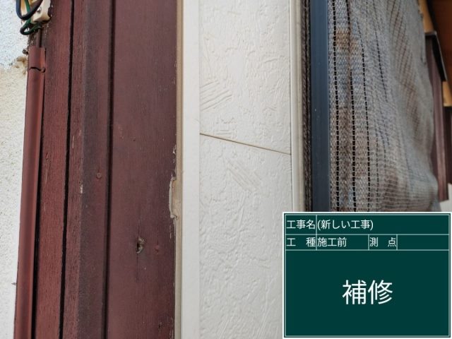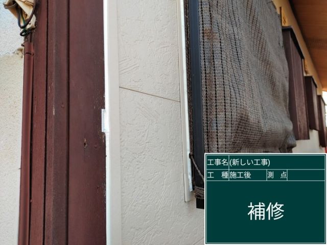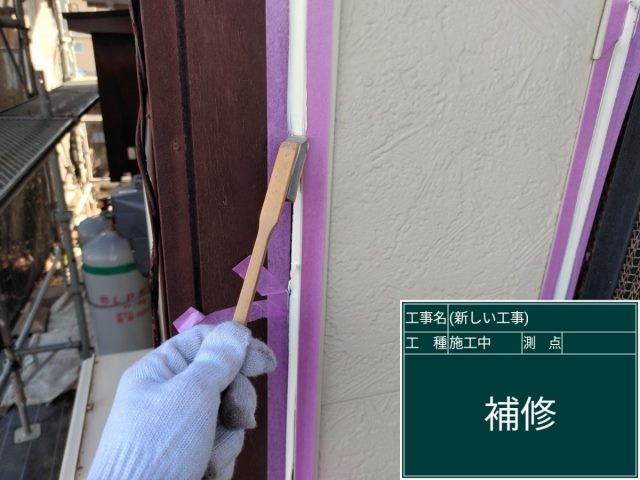 リシン吹きのモルタル外壁、塗装をおこなう前に、補修をおこなっていきます。