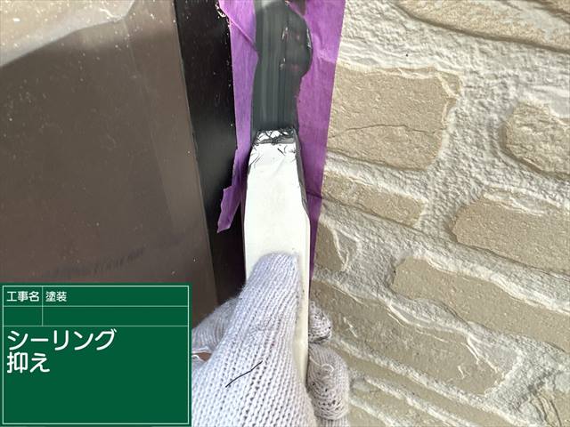 塗装が白っぽい現在のものから、茶系のシックな色に変わるため、シーリングの色も合わせていきました(^o^)