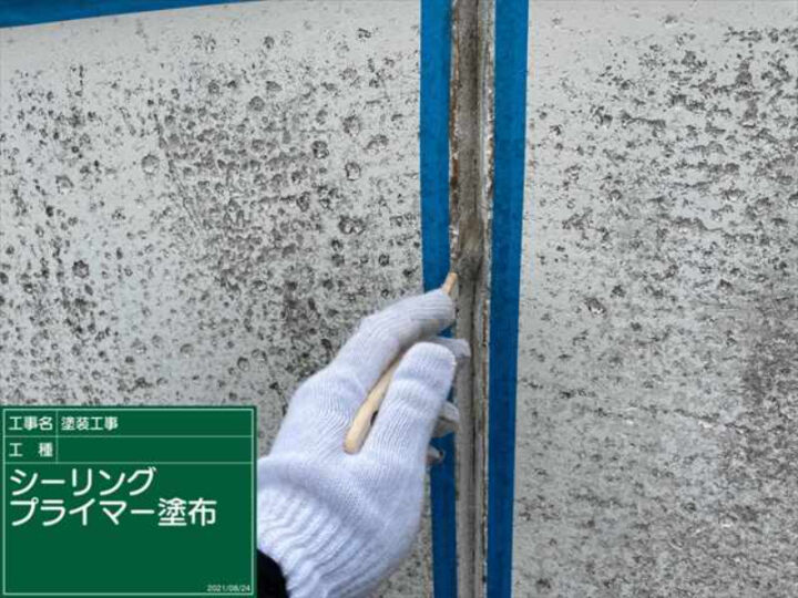 シーリングを撤去した目地に、プライマーを塗布していきます。