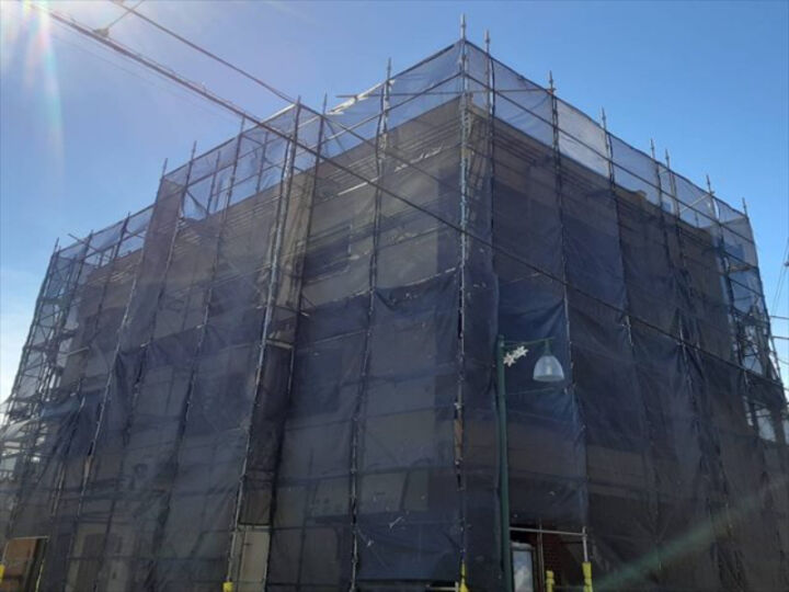 飛散防止のシートを取り付けて、汚れた水が近隣に飛び散らないようにしていきます。