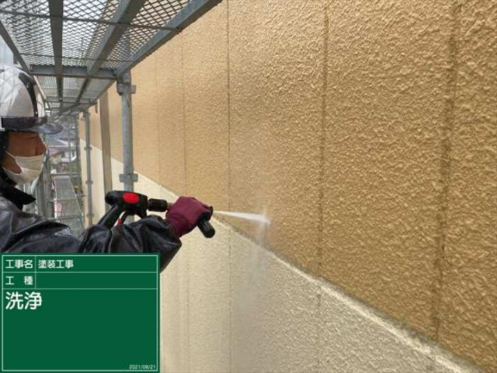 高圧洗浄中の右の写真では、黒ずみが落ちているのが分かりますね。