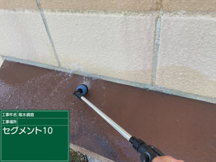 雨漏りがどこで起きているのか確認するために、水をかけ散水調査をおこないます。