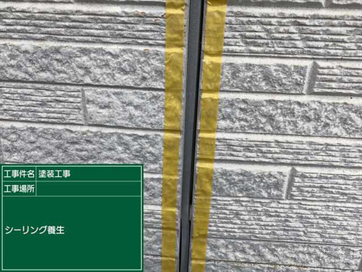マスキングテープによる養生は、シーリングが外壁にはみ出して汚れてしまわないようにおこないます。