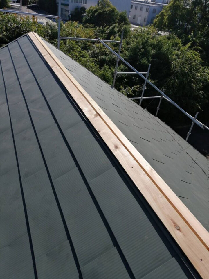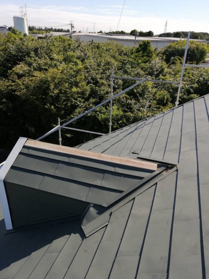 台風で屋根棟板金と雨樋が破損。火災保険適用で交換工事を行いました。