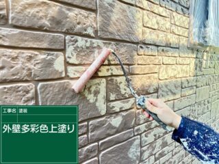外壁の劣化が見られたので、クリア塗装ではなく多彩色塗装でデザイン性を残した塗り替え工事をご提案しました💡