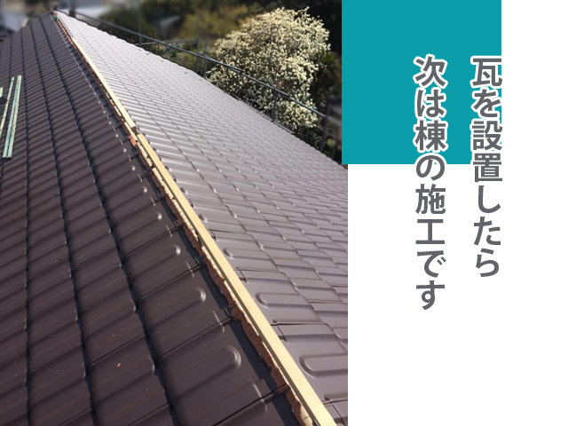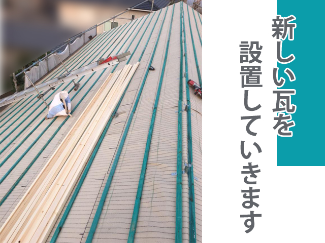 瓦桟に新しい瓦屋根を葺いて固定していきます🔨