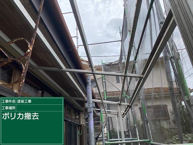 土浦市築42年の現場、劣化したポリカを撤去していきます。
