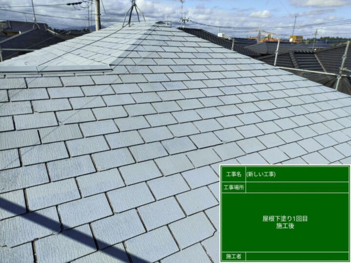 屋根材と上塗り塗料との密着性を高めるため、シーラーを塗布していきます。