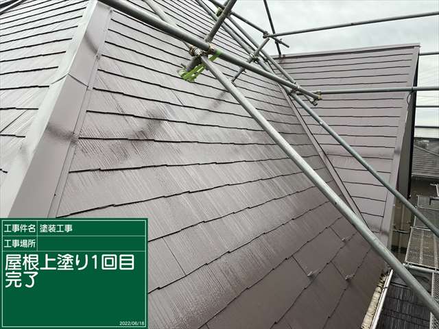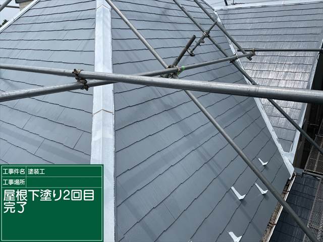 石岡市のスレート屋根は傷んでいたため、下塗りを2回おこないました。