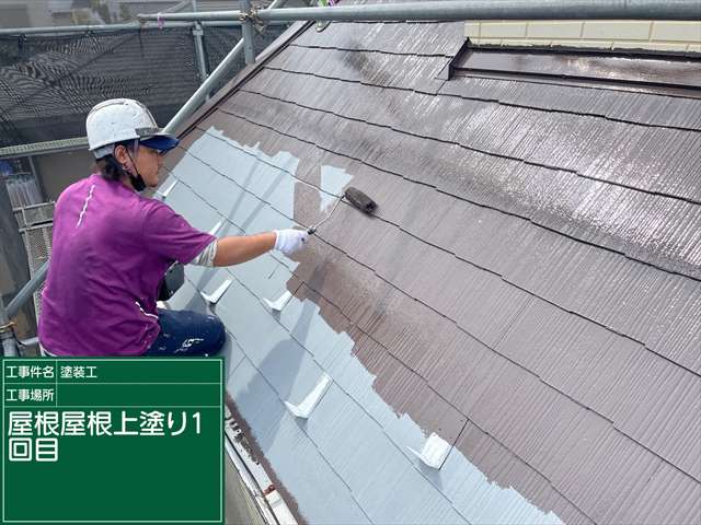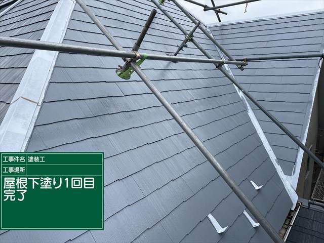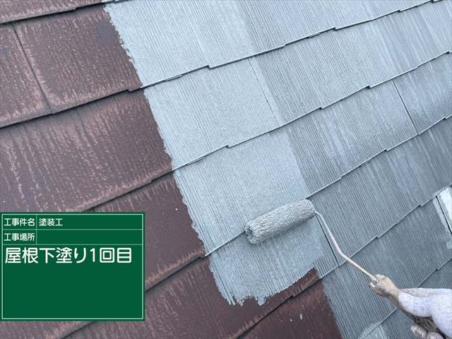 石岡市の屋根塗装。スレート屋根に遮熱効果のある下塗りをしていきます。
