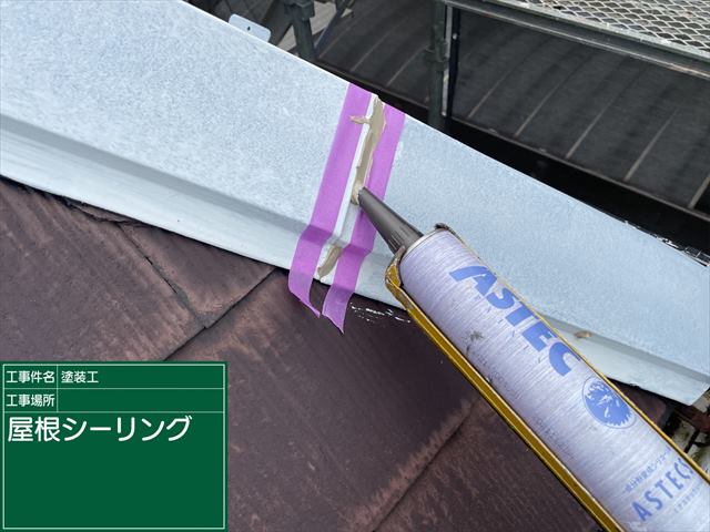 棟板金の隙間は雨水の侵入経路となり、雨漏りに繋がるため、シーリングで隙間を埋めていきます。