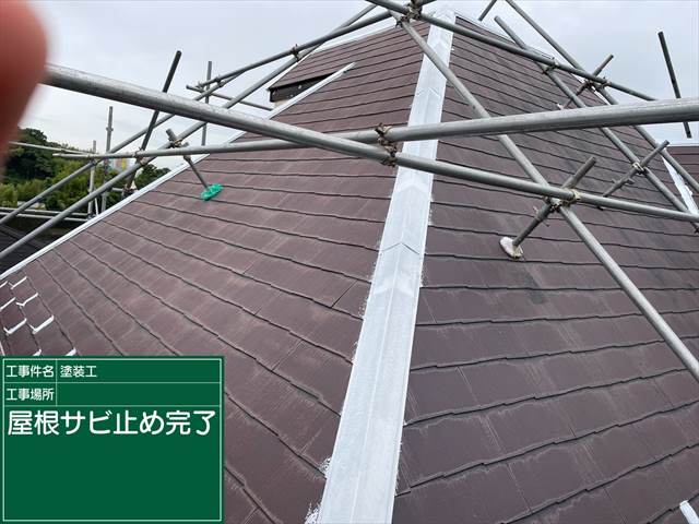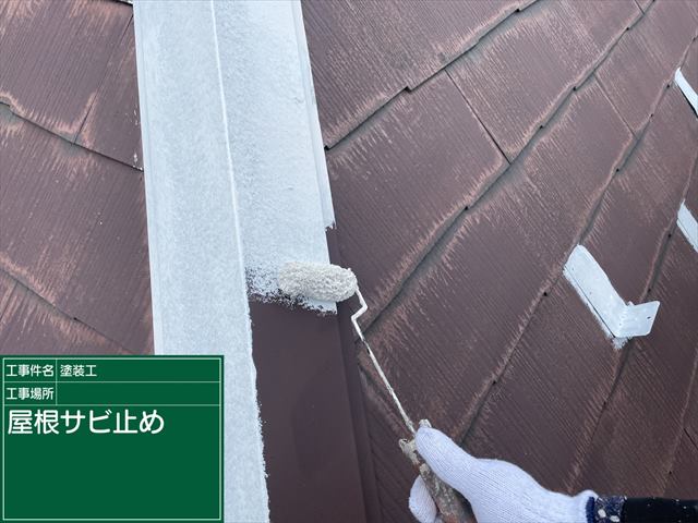 石岡市でおこなった屋根塗装。屋根の棟板金の塗装、サビ止め(下塗り)です。