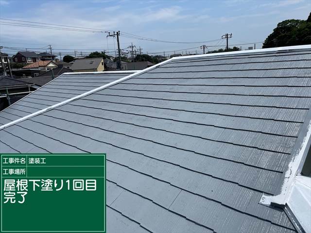 石岡市の屋根塗装現場、屋根塗装の下塗り1回目が完了しました。