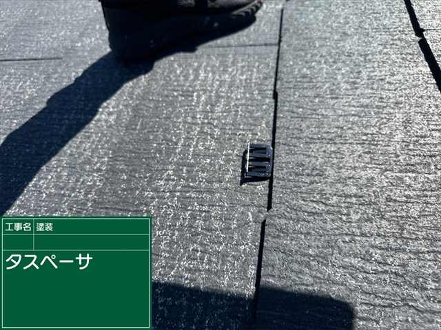 1枚のスレート屋根瓦につき、2個のタスペーサーを使って、確実な縁切りをおこない、雨漏りを防止していきます。