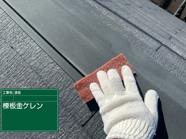 石岡市築11年の屋根、まずは板金のケレン作業をおこないます。