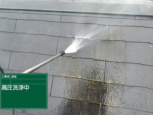 石岡市築11年の屋根塗装現場、高圧洗浄でスレート屋根についた苔を落としていきます。