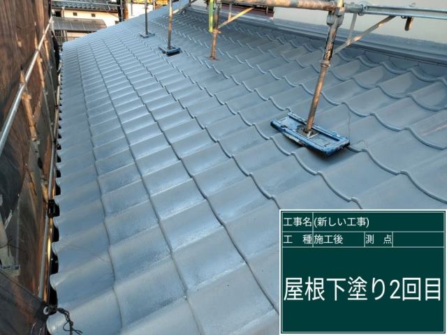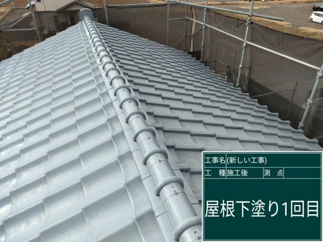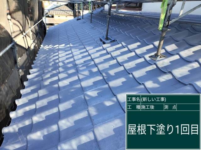 たっぷりと下塗りを塗ることで、傷んだ瓦の塗料の吸い込みを止めて、上塗り塗装でつくられる塗膜を丈夫にしていきます。