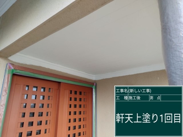 軒天塗装の上塗り2回をおこない、施工完了です。