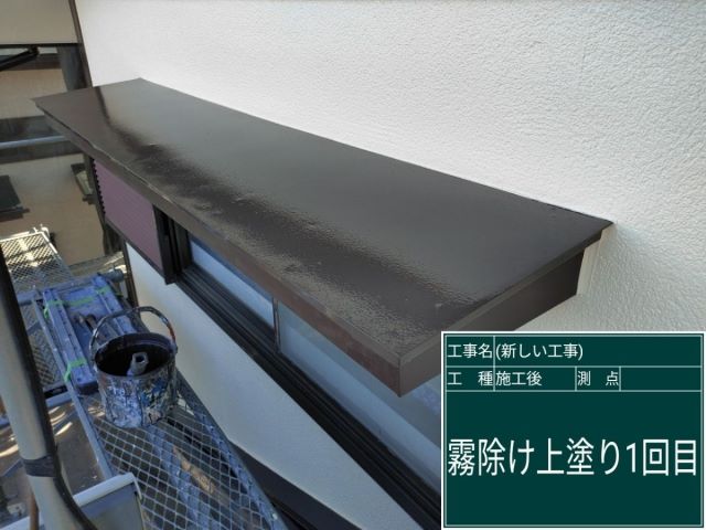 下塗りに遮熱効果のある塗料を使うことにより、霧除けの温度上昇を防ぎ、室温上昇も抑えていきます。