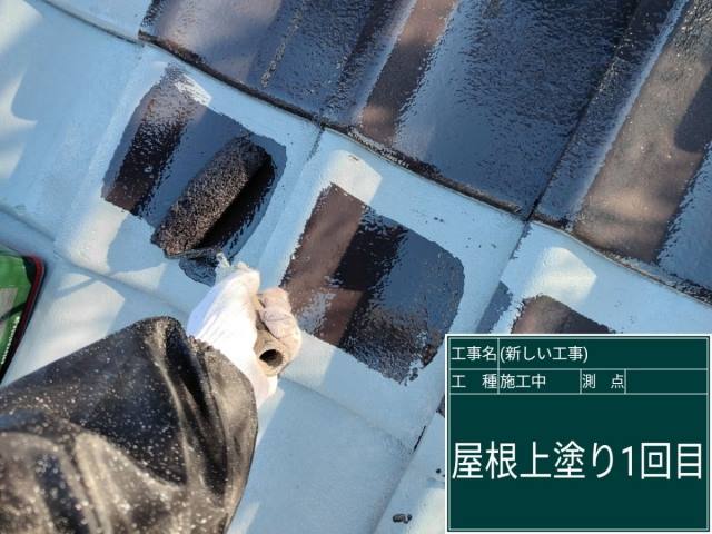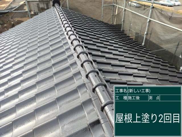 石岡市のモニエル瓦の屋根塗装現場では、下塗りと上塗りでそれぞれ遮熱効果のある塗料を使用しました!