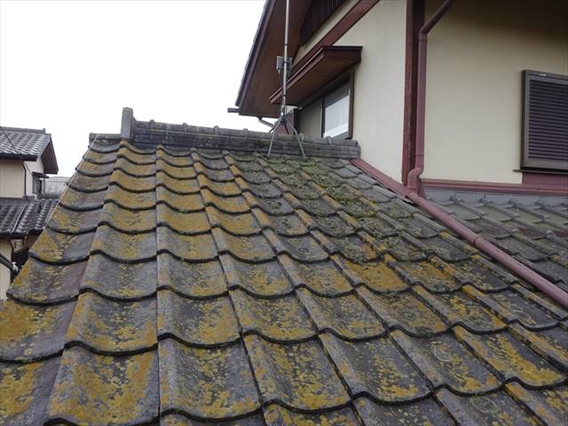 苔が広がっていた屋根瓦は、同じく遮熱効果のある下塗り塗料「サーモテックシーラー」を2回塗って、傷んだ瓦が上塗り塗料を吸い込まないように対処してあります。