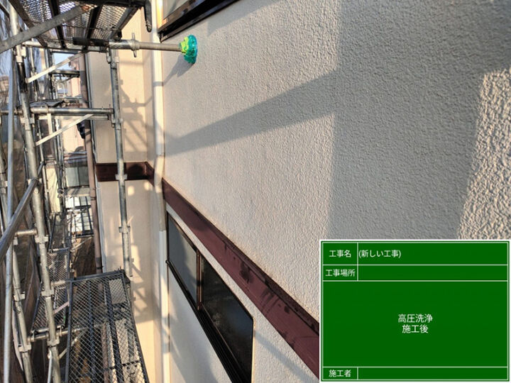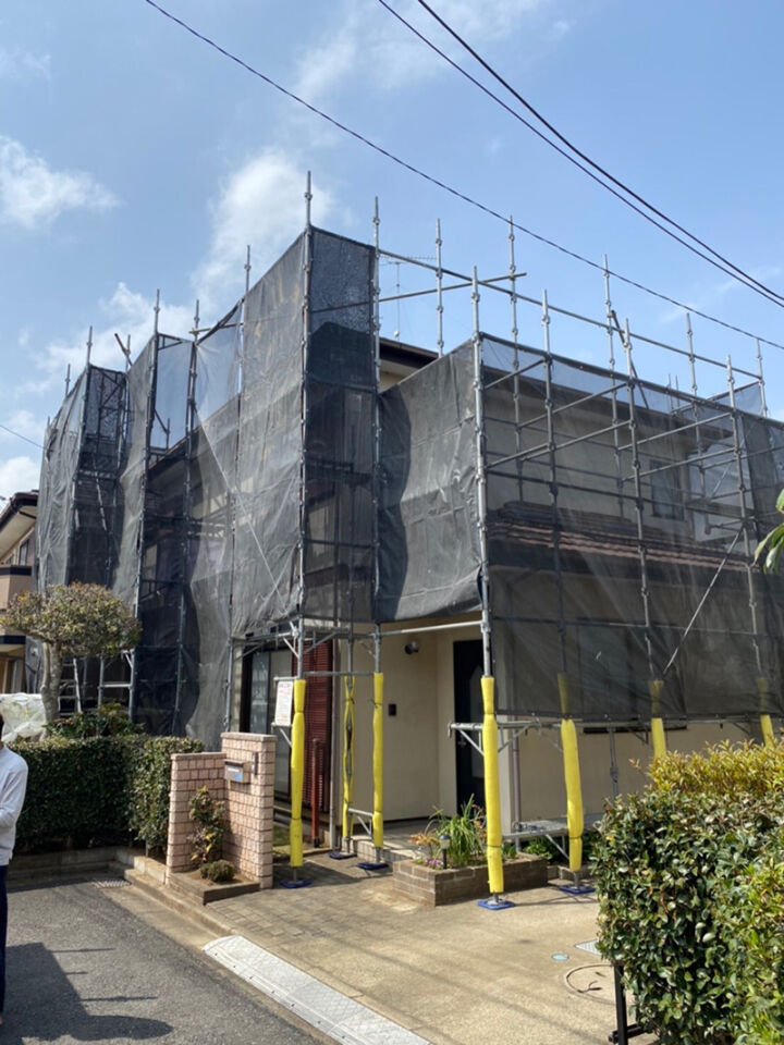 今回は塗装前の下準備として、足場の設置と高圧洗浄の様子をご紹介します。