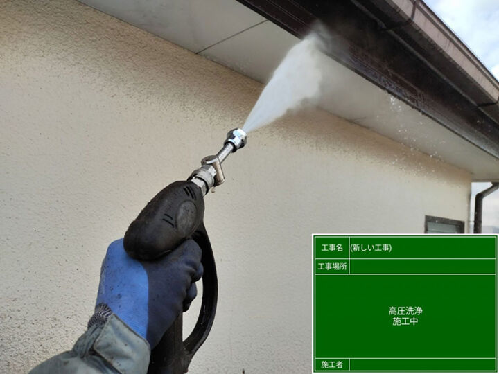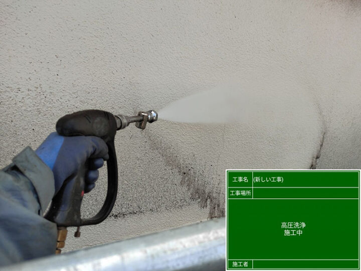 塗装工事を行う前に、まずは工事をする際に必要不可欠な足場を設置いたします。設置後、長年蓄積された汚れや古い塗膜を落とす為、高圧洗浄機を使用してしっかりと洗っていきます。