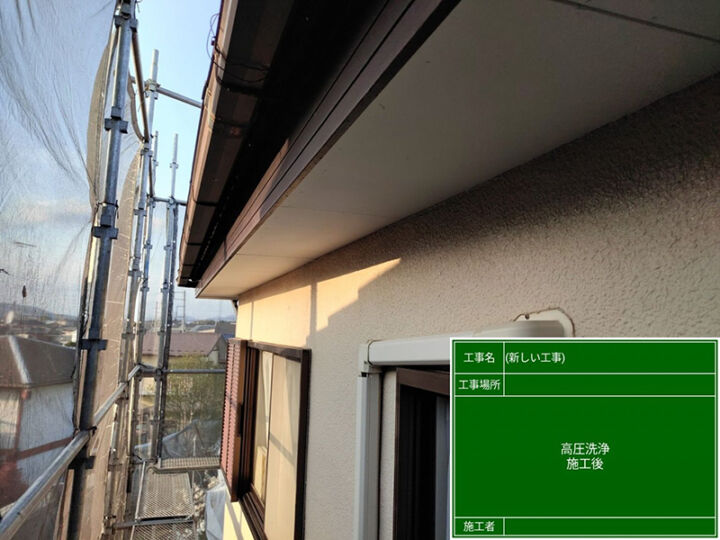 こちらの写真では、洗浄前と後で撮影箇所が若干変わってしまっており、撮影時間も昼間と夕方とで変わってきてしまっている為、汚れのとれ具合がイマイチ確認しにくいのですが、軒天の汚れと共に壁についていた汚れも綺麗になっているのがお分かり頂けるかと思います。