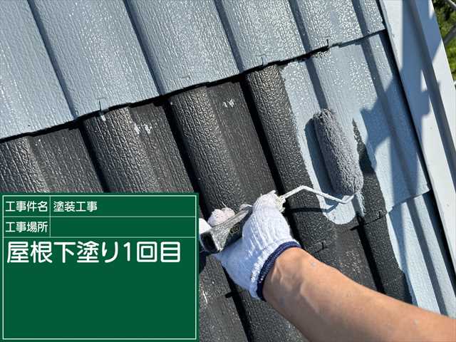 補修が終わったモニエル屋根に、下塗りをおこないます。