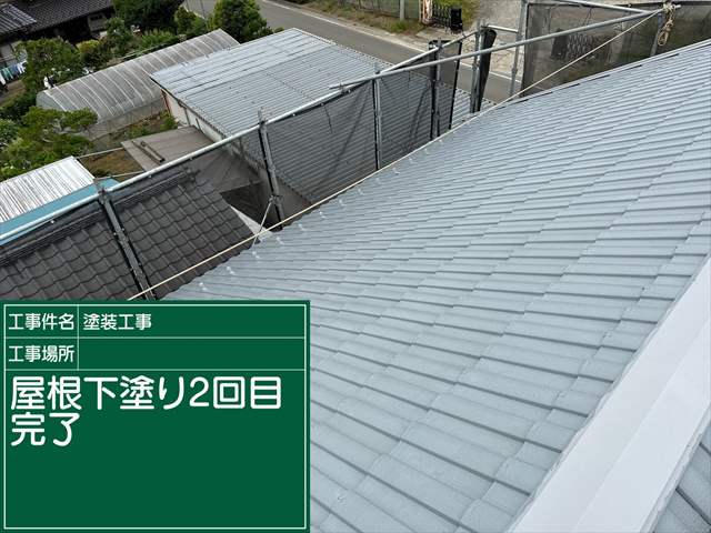 モニエル瓦屋根の塗装、上塗りの1回目が完了です。