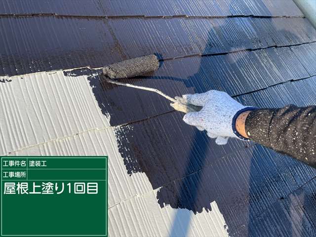 かすみがうら市の屋根塗装現場、1回目の上塗りが完了しました。