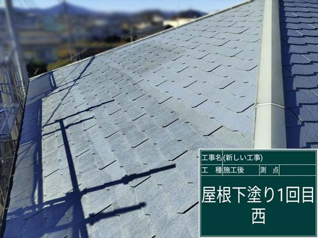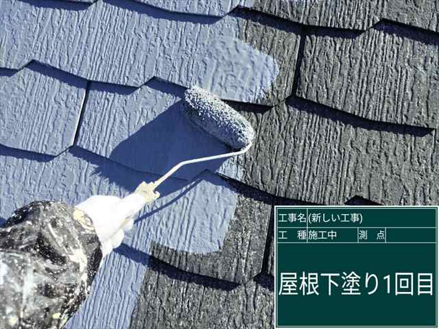 かすみがうら市の屋根塗装現場、1回目の下塗りが終わりました。
